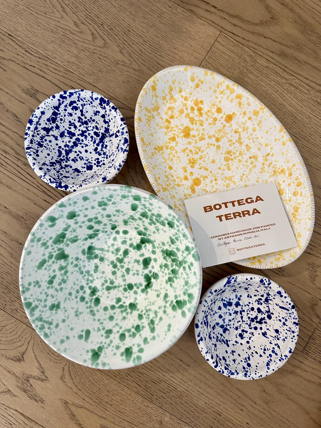Our Mediterranean Serving Bowl is hand painted and made by our artisans in Puglia, Italy. Each bowl is unique, with the splatter patterns adding a personal touch and slight variations in design.